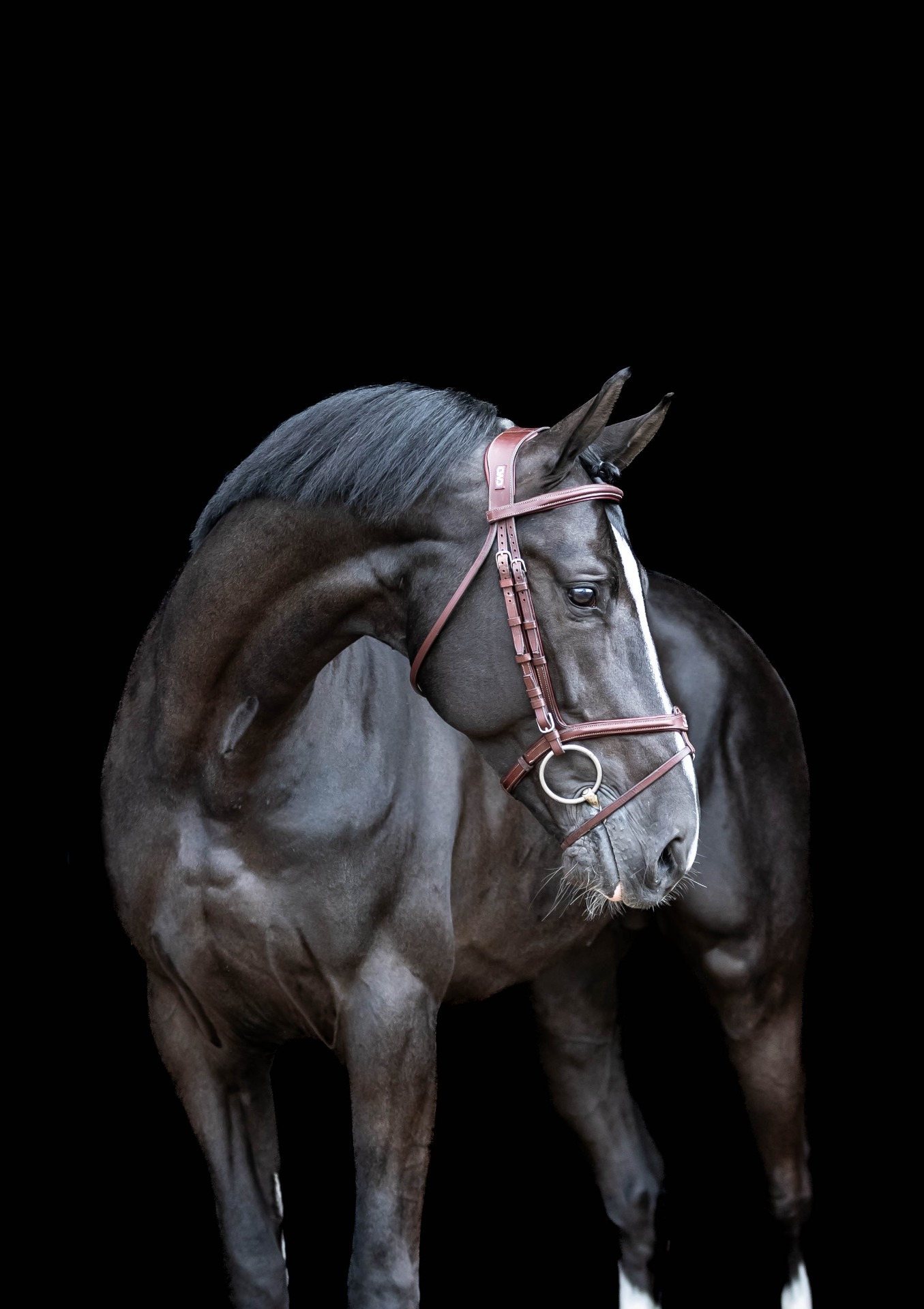 Harmonisk välproportionerlig. Väl ansatt hals, hög manke, djupa branta bogar, djup